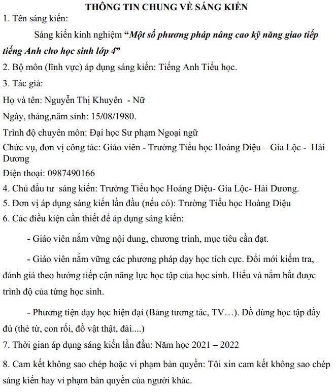 Một số phương pháp nâng cao kỹ năng giao tiếp tiếng Anh cho học sinh lớp 4